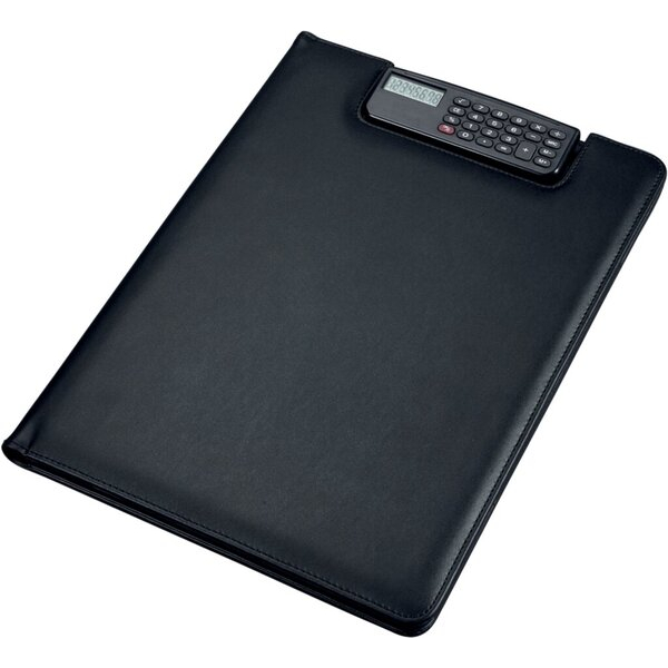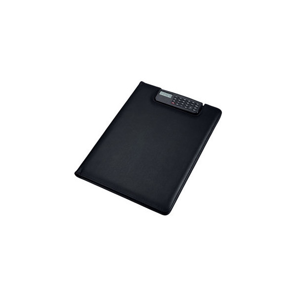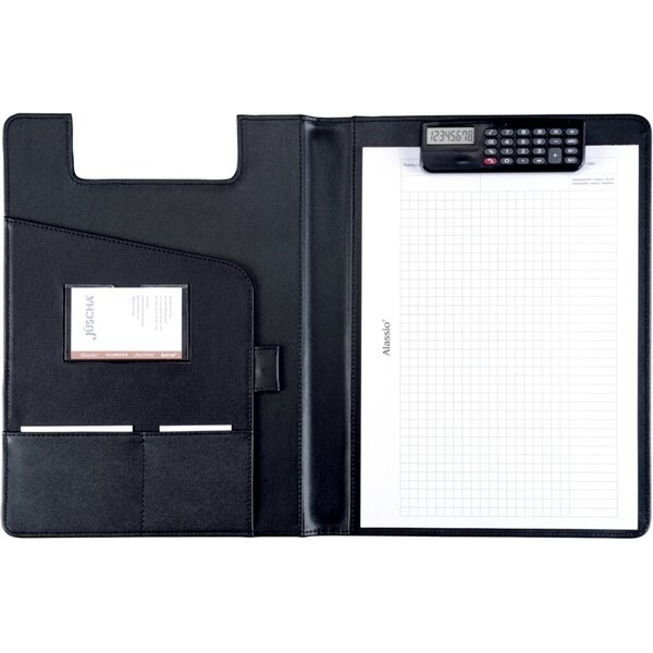 Die Klemmbrettmappe verfügt über einen integrierten Taschenrechner, der durch eine praktische Aussparung jederzeit griffbereit ist. Zudem können Sie einen Schreibblock mühelos unter der Klemmleiste fixieren. Auf der linken Seite finden Sie ein A4-Einschubfach sowie zwei darüber liegende Einsteckfächer, ein Klarsichtfach für Visitenkarten und eine Schreibgeräteschlaufe – alles, was Sie für Ihre Notizen und Unterlagen benötigen.