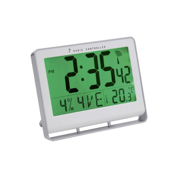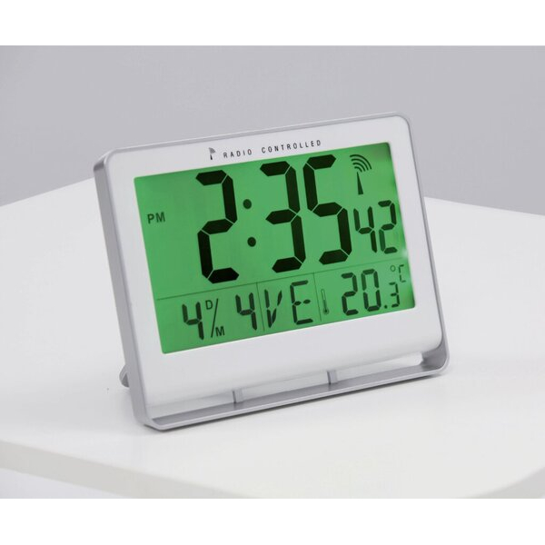 Die Uhr ist einfach umschaltbar auf 12- oder 24 Stunden und bietet zusätzlich praktische Funktionen wie Datums-, Temperatur- und Wochenanzeige in 5 verschiedenen Sprachen. Sie können die Uhr entweder an der Wand befestigen oder bequem auf den Tisch stellen.