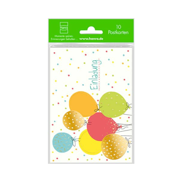 Fröhlich bunte Einladungskarten im praktischen Postkartenformat. Das Set enthält 10 Postkarten, deren Rückseite einen Vordruck haben. Die Karten sind im Offsetverfahren auf weißen Karton gedruckt und haben ein handliches Format von 10,5x14,8 cm.