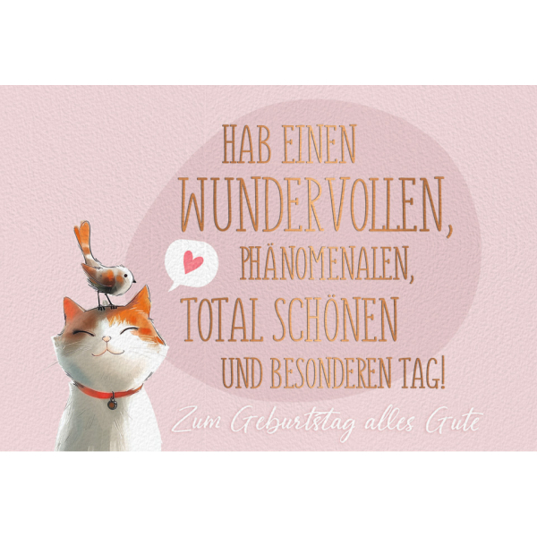 Die Geburtstagskarte im Querformat aus strukturiertem, weißem Karton zeigt ein liebevolles Motiv mit Katze und Vogel sowie eine feine Prägung.