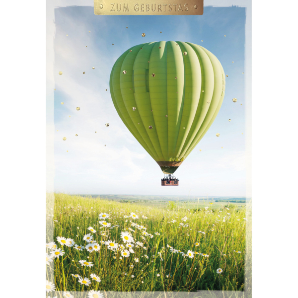 Die Geburtstagskarte besteht aus glattem, weißem Karton und zeigt ein stimmungsvolles Motiv mit einer Wiese und einem bunten Heißluftballon. Die feine Prägung verleiht der Karte eine elegante Note. Darüber hinaus wird die Druckkarte klimafreundlich und unverpackt angeboten, ohne Cellophanhülle, und sie verfügt über einen innen liegenden Umschlag. Ideal für nachhaltige und persönliche Geburtstagsgrüße!