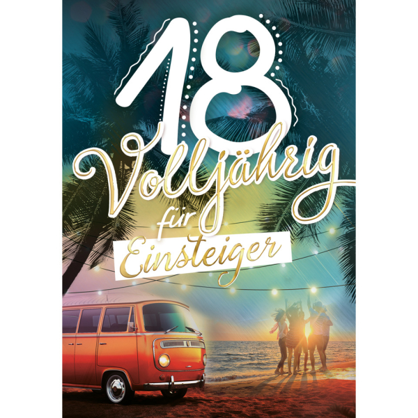 Feiern Sie das besondere Ereignis mit den Geburtstagskarten 54-2918 Jubiläumsjahr bunt von Alpedia. Die große Zahlengeburtstagskarte im A4-Format ist ideal für den besonderen Anlass der Volljährigkeit. Die Druckkarte aus weißem Karton zeigt ein frisches Motiv mit Strand, Sonne, Meer und Bulli – passend für alle, die ins Leben starten. Mit Innendruck und viel Platz für persönliche Worte. Perfekt als Einsteigerkarte zum 18. Geburtstag im großzügigen Jumbo-Format.