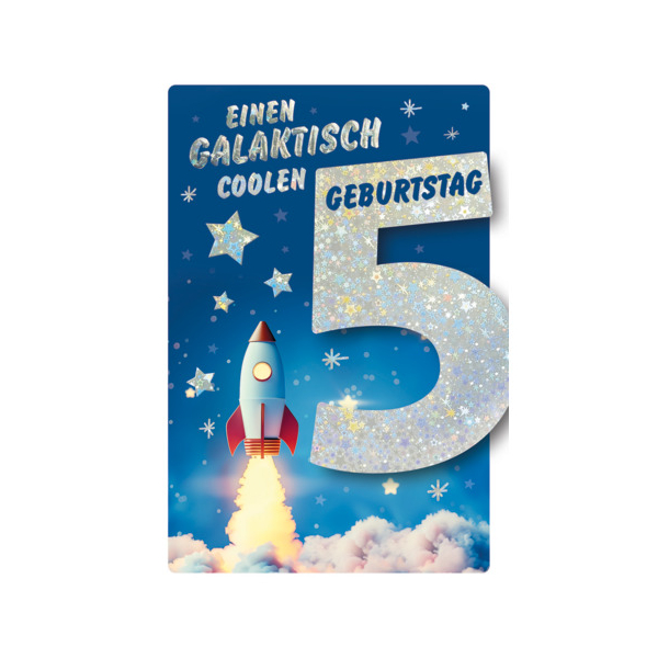 Entdecken Sie die fröhlichen Geburtstagskarten von Alpedia, die perfekt für den 5. Geburtstag Ihres Kindes geeignet sind. Die Karte zeigt ein kindgerechtes Motiv mit einer bunten Rakete und der großen Zahl „5“, die Kinderaugen zum Strahlen bringt. Diese Druckkarte aus weißem Karton ist mit einer feinen Prägung veredelt, was sie zu einer idealen Wahl für Jungen macht, die ihren besonderen Tag feiern möchten. Sie ist bunt, verspielt und voller Geburtstagsfreude.