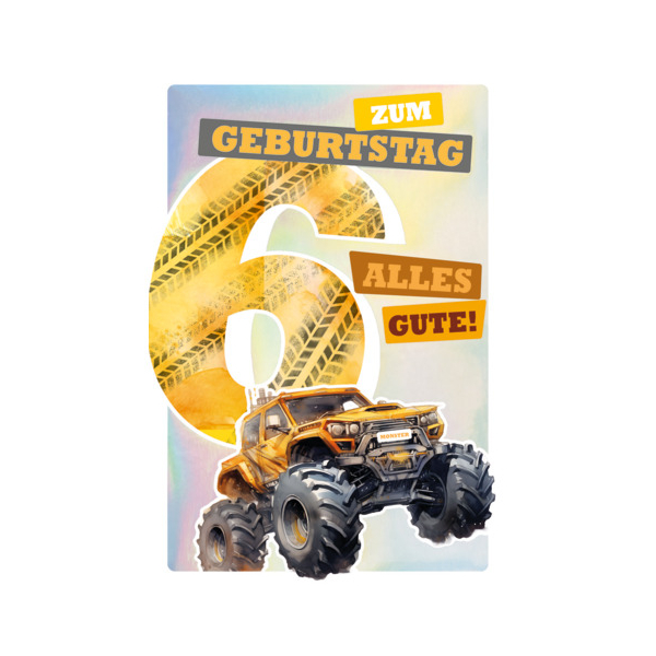 Entdecken Sie die lebhafte Geburtstagskarten 54-4206 aus dem Hause Alpedia. Diese besondere Karte für Kinder begeistert mit einem coolen Motiv, das einen Monstertruck und die große Zahl „6“ zeigt, sowie dem einladenden Schriftzug „Zum Geburtstag alles Gute“. Die Druckkarte ist aus hochwertigem weißen Karton gefertigt und mit einer feinen Prägung versehen – ideal für kleine Autofans, die ihren 6. Geburtstag feiern.