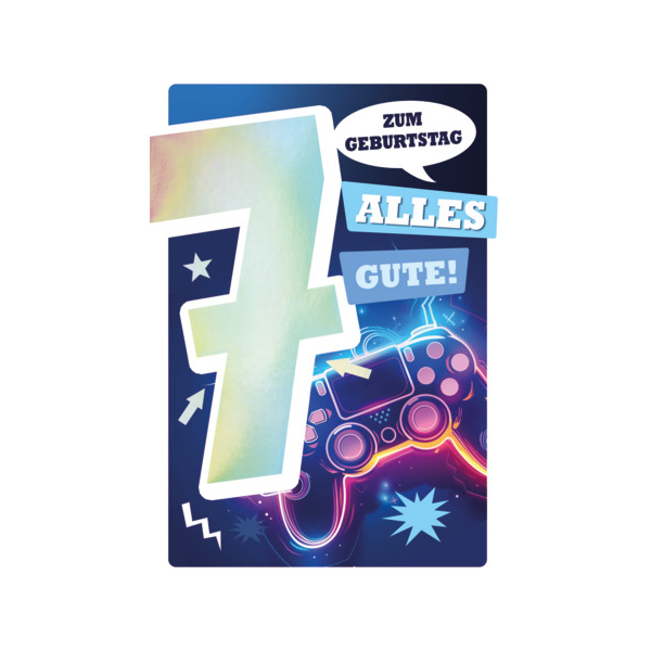 Entdecken Sie die farbenfrohen Geburtstagskarten 54-4207 von Alpedia, die mit einem fröhlichen Konsolen-Motiv zum 7. Geburtstag überzeugen! Diese Karte enthält eine große geprägte Zahl 7 und viele liebevolle Details, die sie zur perfekten Wahl für kleine Gamer machen.