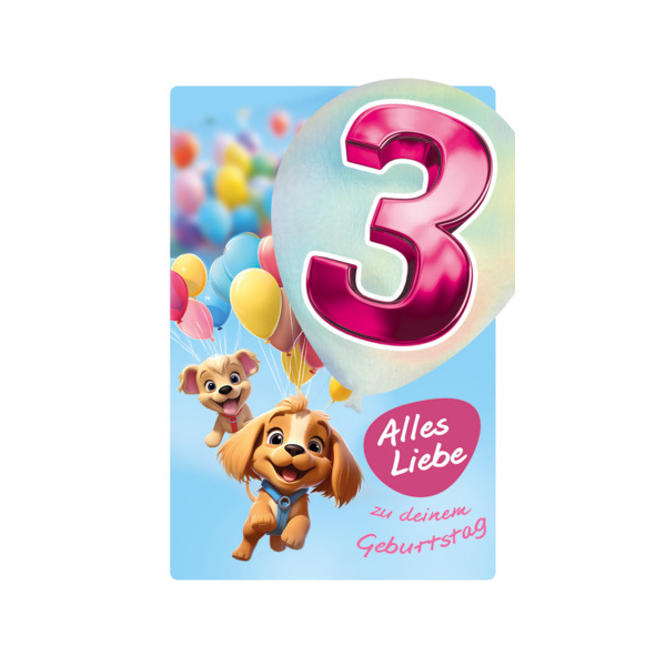 Feiern Sie den besonderen Tag eines kleinen Mädchens mit unseren fröhlichen Geburtstagskarten 54-4303! Diese liebevoll gestaltete Karte ist ideal für den 3. Geburtstag und bringt mit süßen Hunden, bunten Luftballons und einer großen, geprägten Zahl 3 Freude ins Fest.