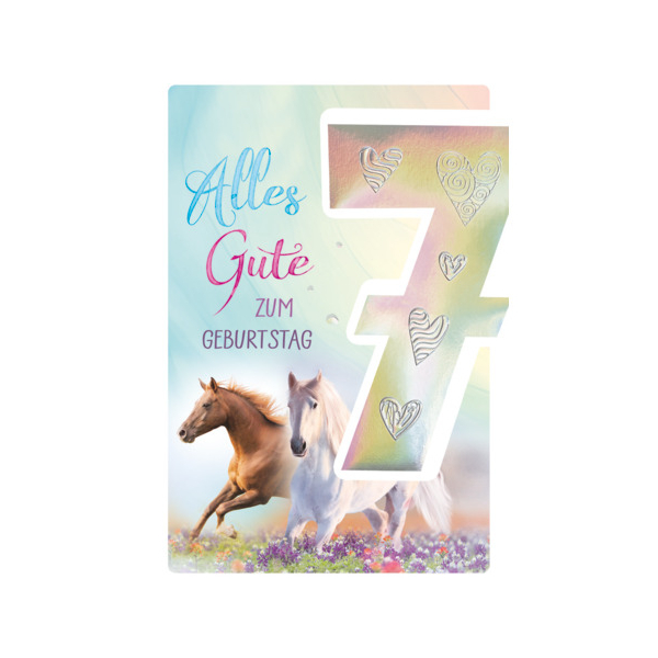Entdecken Sie die bezaubernde Geburtstagskarten 54-4307, die speziell für kleine Pferdefreundinnen entworfen wurde. Diese liebevoll gestaltete Karte zeigt ein kindgerechtes Motiv mit Pferden, einer großen Zahl „7“ und dem herzlichen Schriftzug „Alles Gute zum Geburtstag“. Die Druckkarte aus weißem Karton ist mit einer feinen Prägung veredelt und macht jeden Geburtstag zu einem besonderen Ereignis.