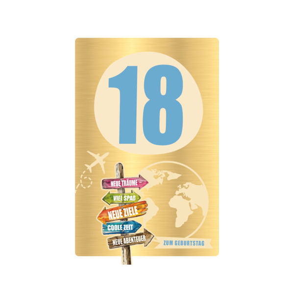 Entdecken Sie die stilvoll gestaltete Geburtstagskarte 54-4318 von Alpedia, die zur Feier der Volljährigkeit perfekt geeignet ist. Diese bunte Karte zeigt ein modernes Motiv mit Weltkugel, Flugzeug und Wegweisern – ideal für den aufregenden Start in einen neuen Lebensabschnitt. Die Druckkarte im Format 11,5 x 17 cm besteht aus hochwertigem weißen Karton mit feiner Prägung und eignet sich hervorragend für junge Erwachsene, die ihren 18. Geburtstag feiern und bereit sind, die Welt zu entdecken.