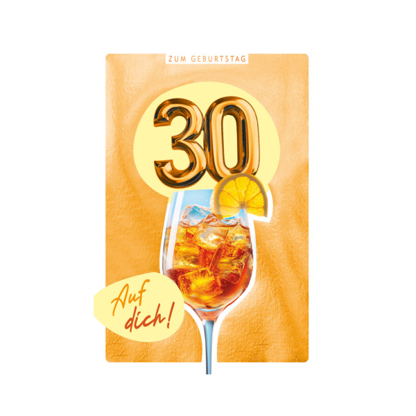 Entdecken Sie die stilvolle Geburtstagskarten 54-4330 von Alpedia, die perfekt für das Jubiläumsjahr sind. Diese modern gestaltete Karte zeigt ein frisches, farbenfrohes Motiv mit einem Cocktailglas, einer Zitronenscheibe und der großen Zahl „30“. Der einladende Schriftzug „Auf Dich“ sowie eine hochwertige Prägung verleihen der Karte eine besondere Eleganz, die bei jedem Empfänger für Freude sorgen wird.