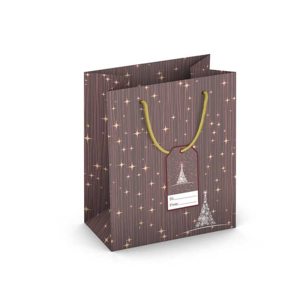 Die Ausführung mit einer gedrehten Kordel und einer Karte macht das Verschenken noch einfacher und stilvoller. Das fröhliche Motiv mit Bäumen und Sternen sorgt dafür, dass Ihre Geschenke in dieser festlichen Jahreszeit besonders gut zur Geltung kommen.