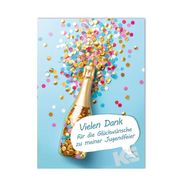 Set von 5 Karten im Format 11,5 x 17 cm. Jede Karte ist auf glattem, weißem Karton gedruckt und zeigt eine fröhliche Flasche mit Konfetti als Symbol für die Feierlichkeiten. Die stilvolle Druckkarte eignet sich perfekt, um sich für die Glückwünsche und Geschenke zur Jugendfeier zu bedanken. Das Set enthält 5 Danksagungskarten, die im Cellophanbeutel mit weißen Umschlägen geliefert werden.