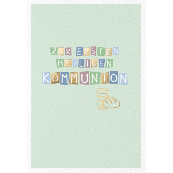 Diese elegante Kommunionskarte im Format 11,5 x 17 cm ist aus strukturiertem, weißem Karton gefertigt und verleiht dem besonderen Anlass eine festliche Note. Das Motiv mit Brot und Kelch symbolisiert den christlichen Ursprung der Kommunion, während die bunte Schrift und die edle Prägung einen modernen Akzent setzen. Ideal für Einladungen oder Dankeskarten zur Kommunion.