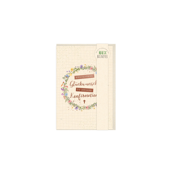 Die Grußkarte „Konfirmation Green Line“ ist eine stilvolle und umweltfreundliche Karte zur Konfirmation. Sie hat das Format 11,5 × 17 cm und ist im Hochformat gestaltet. Gefertigt ist sie aus nachhaltigem Zuckerrohrpapier. Eine farbige Metallicfolie verleiht der Karte einen edlen Glanz. Die Karte kommt ohne Applikationen aus und wird mit einem passenden Kuvert aus Zuckerrohrpapier geliefert. Eine Verkaufseinheit enthält 5 Karten inklusive Kuverts.