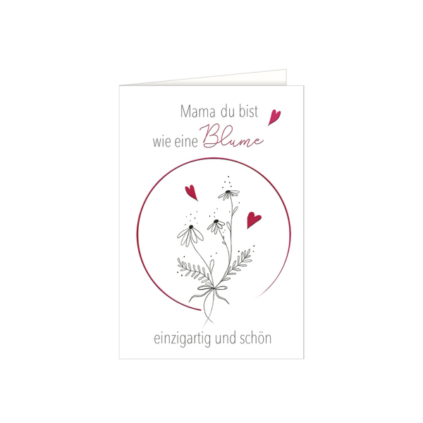 Diese schlichte und elegante Glückwunschkarte zum Muttertag zeigt einen Kreis darin sind gemalte Blumen. Der Schriftzug lautet: "Mama du bist die wie eine Blume einzigartig und schön". Die Karte ist mit edler rot glänzender Folienprägung veredelt.