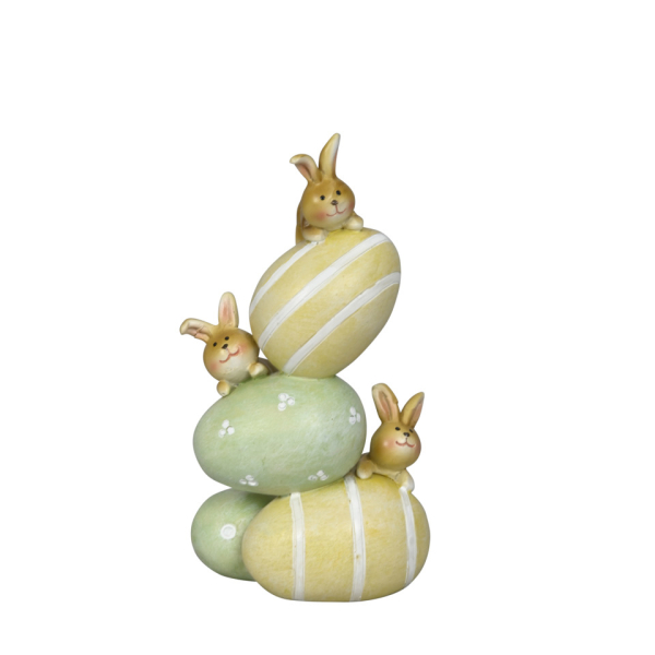 Fröhlicher Osterhase auf Ei aus robustem Polyresin, ca. 6,5 x 4,5 x 12 cm groß. In frischen Grün- und Gelbtönen – die perfekte Dekoration für Frühling und Ostern.