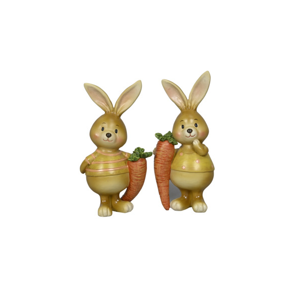 Dieser niedliche Osterhase mit Karotte aus robustem Polyresin ist der perfekte Frühlings-Blickfang! Mit den Maßen von ca. 7 x 6 x 14 cm bringt er fröhliche Farbe in deine Osterdekoration. Die Hasen sind in den Farben Orange und Gelb sortiert. Lieferung 2-fach sortiert.