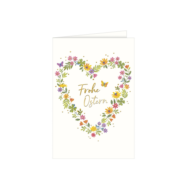 Diese Osterkarte mite einem wundeschönen gemalten Herz aus Frühlingsblumen und dem Text: "Frohe Ostern", der mit Godfolieprägung veredelt wurde. Gedruckt wurd edie Karte auf Naturkarton von Gmund.