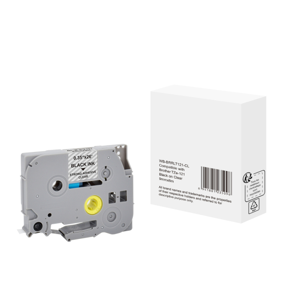 Schriftband TZE-121, 9mm x 8m, schwarz/transparent, laminiert, kompatibel zu P-touch TZe-121