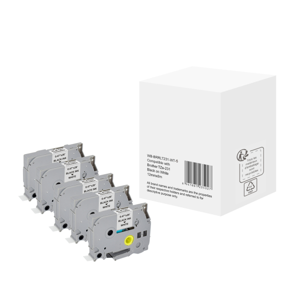 Alpedia Schriftband WBBRRLT231WT5, 12mm x 8m, schwarz/weiß, laminiert, kompatibel zu P-touch TZe-231