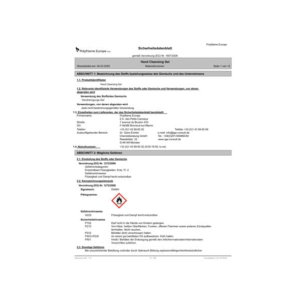Firmenname: Polyflame Europe Z.A. des Petits Carreaux, Straße: 7 avenue du Bouton d'Or, Ort: F-94386 Bonneuil-sur-Marne, Telefon: +33 (0)1 43 99 60 00 Telefax:+33 (0)1 43 99 60 99 | Auskunftgebender Bereich: Dr. Gans-Eichler, Chemieberatung GmbH, Raesfeldstr. 22, D-48149 Münster - Tel.: +49(0)251/394868-69 / Telefax:+33 (0)1 43 99 60 99, Email: info@tge-consult.de