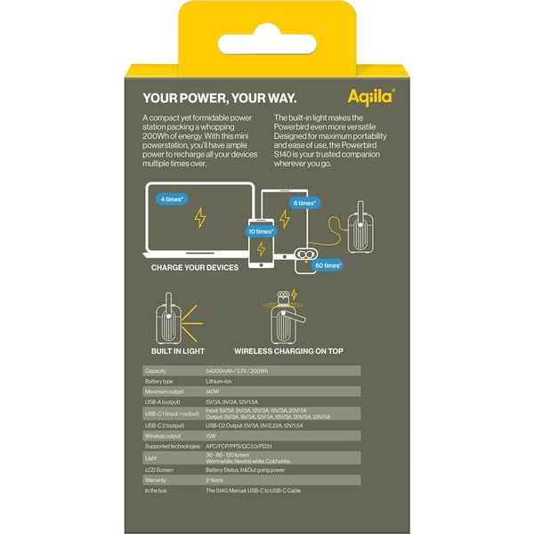 Die Powerbank POWERBIRD S140PBI997 von Aqiila ist die perfekte Lösung für alle, die viel unterwegs sind und ihre Geräte stets mit Energie versorgen möchten. Mit einer beeindruckenden Kapazität von 54000 mAh können Sie Ihr Smartphone, Tablet oder andere elektronische Geräte mehrmals aufladen, ohne sich um die nächste Steckdose sorgen zu müssen.