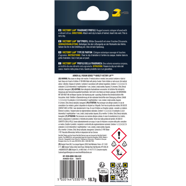 Erleben Sie den einzigartigen Lufterfrischer E304259400 von ArmorAll in der aufregenden Oracle Red Bull Racing Serie. Dieser Premium Auto-Lufterfrischer besticht durch sein vom Rennsport inspiriertes Design und lässt sich bequem an den Lüftungsschlitzen Ihres Fahrzeugs befestigen. Genießen Sie individuelle Duftregulierung und erleben Sie belebend-frische Fahrmomente mit einem Duft, der bis zu 40 Tage anhält unter normalen Umgebungsbedingungen.