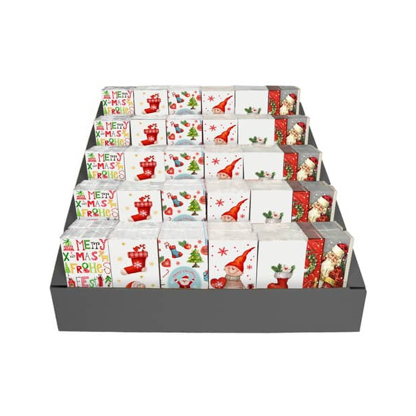 Jede Packung enthält 10 Tücher, die in 6 verschiedenen, festlichen Motiven sortiert sind. Die bunten Designs bringen eine fröhliche Atmosphäre in Ihre Feiertage und sind ideal für Weihnachtsfeiern oder als kleine Aufmerksamkeit für Ihre Gäste.