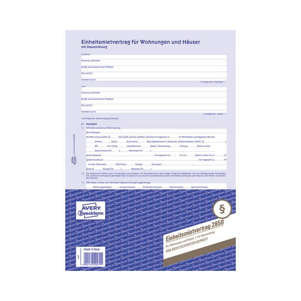 "Mietvertrag A4 m.Hausordnung";"Der Einheitsmietvertrag 2850 für Wohnungen und Häuser von AVERY ZWECKFORM im DIN A4 Format schafft klare Verhältnisse, egal ob Sie Mieter oder Vermieter sind. Der 6-seitige Mietvertrag für Wohnungen und Häuser im Bogenformat regelt alle wichtigen Punkte des Mietverhältnisses inklusive der Schönheitsreparaturen. Zudem enthält Mietvertrag eine Hausordnung. Die Mietverträge und Vordrucke von Avery Zweckform sind eine zuverlässige, bewährte Grundlage für eine sichere Regelung des Mietverhältnisses und werden regelmäßig von Rechtsexperten auf Änderungen im Mietrecht geprüft und angepasst."