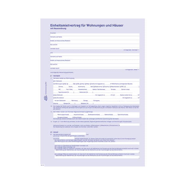 Ausführlicher Mietvertrag (ehemals Einheitsmietvertrag) für die Vermietung von Wohnraum. Mit Hausordnung und detaillierten Angaben zu Miete und Nebenkosten, Format DIN A4, 6seitig. Rechtsicher und aktuell entsprechend den gesetzlichen Bestimmungen des Mie