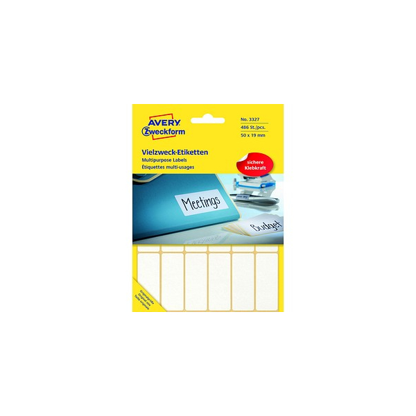 Die Vielzweck-Etiketten von AVERY Zweckform sorgen für blitzschnelle Ordnung und schaffen Übersicht. Alle Vielzweck-Etiketten sind per Hand beschriftbar. Nutzen Sie diesen einfachen und kostensparenden Weg zur Organisation Ihres Büros. Ideal zum Kennzeichnen, Beschriften, Markieren und Hinweisen. Schaffen blitzschnell Ordnung und Übersicht auf Akten, Unterlagen, Karteikarten etc. Maße: 50 x 19mm. Farbe: weiß. Packung mit 486 Stück.