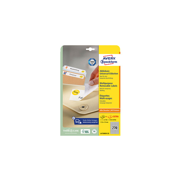 Entdecken Sie die vielseitigen Etiketten L4730REV-25 von AVERY Zweckform, die ideal für Ihre täglichen Beschriftungsbedürfnisse geeignet sind. Diese Universaletiketten im Format 17,8 x 10 mm sind perfekt für die Preisauszeichnung und andere Anwendungen, bei denen Flexibilität gefragt ist.