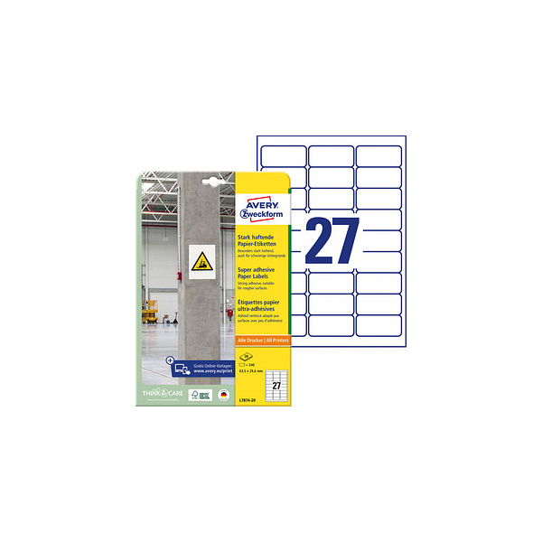 Die weißen, extrem stark haftenden Papier-Etiketten L7874-20 im Format 63,5x29,6mm von AVERY ZWECKFORM haften doppelt so stark wie herkömmliche Papieretiketten. 540 Papieretiketten auf 20 Bogen. Durch die besonders starke Haftung eignen sie sich besonders gut zur Kennzeichnung und Beschriftung von Produkten und Inventar und zur Erstellung von Warn- und Sicherheitshinweisen im Innenbereich. Die Papieretiketten haften auch auf schwierigen Untergründen wie z.B. unebenen, rauhen oder staubigen Oberflächen bei unterschiedlichen Temperaturen. Gestalten und drucken Sie Ihre Aufkleber schnell und einfach - mit den kostenlosen Avery Zweckform Etiketten Vorlagen und Software-Lösungen unter www.avery-zweckform.eu/print oder den im Microsoft® Office Paket integrierten Basis-Vorlagen. Geeignet für alle gängigen Drucker, dabei können Sie sich auf einen problemlosen Druckerdurchlauf ohne Klebstoffablagerungen im Drucker verlassen.