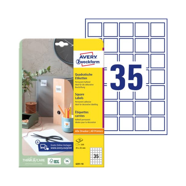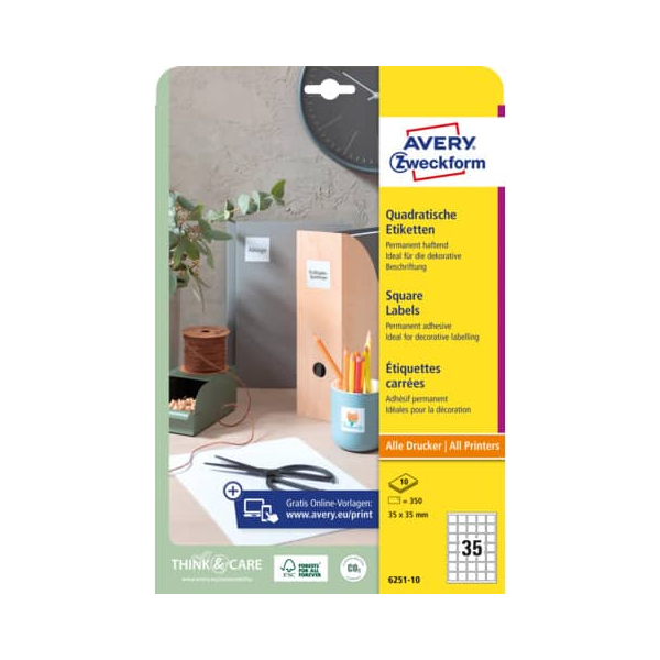 Die Etiketten haben eine Größe von 35 x 35 mm und sind mit einem permanenten Klebstoff ausgestattet, der sicherstellt, dass Ihre Beschriftungen an Ort und Stelle bleiben. Sie sind sowohl für Inkjet- als auch für Laser-Drucker geeignet, einschließlich s/w und Farblaser.