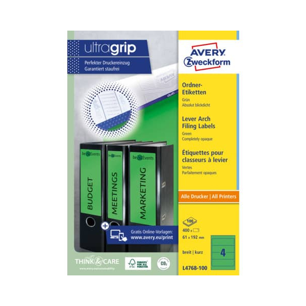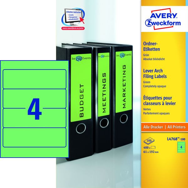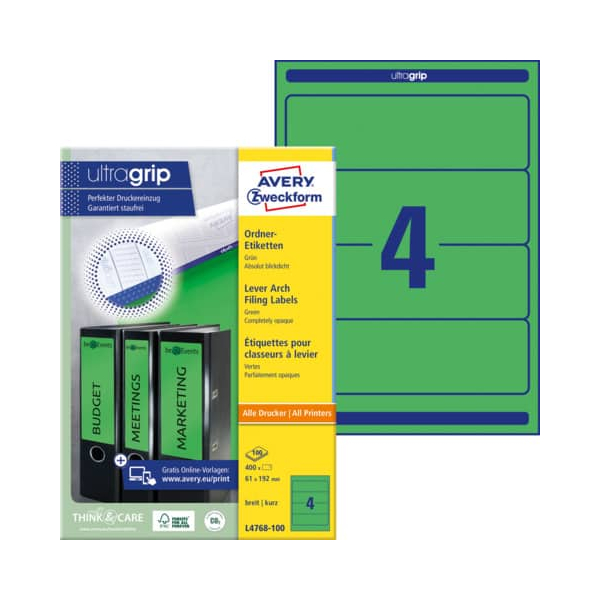 Die selbstklebenden Rückenschilder L4768-100 von AVERY Zweckform in der Farbe grün sind die ideale Lösung, um Ihre Ordner ordentlich und übersichtlich zu gestalten. Mit einem Format von 61 x 192 mm (breit/kurz) haften diese Etiketten dauerhaft sicher auf allen gängigen breiten Standardordnern. Die ultragrip-Technologie sorgt für einen ultrapräzisen Druckereinzug und einen staufreien Druckerdurchlauf, sodass Sie sich auf exzellente Druckergebnisse verlassen können.