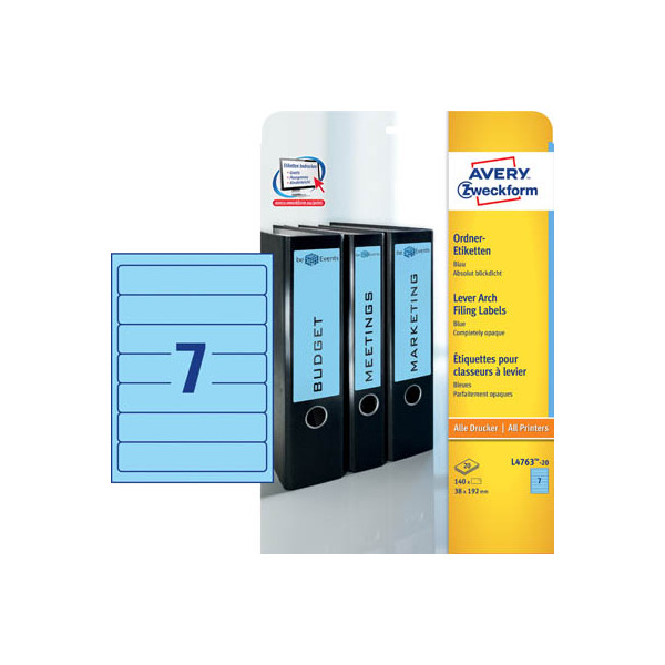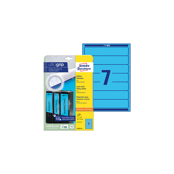 AVERY Zweckform Rückenschilder ultragrip L4763-20, blau, schmal/kurz, 38x192mm, selbstklebend, permanent