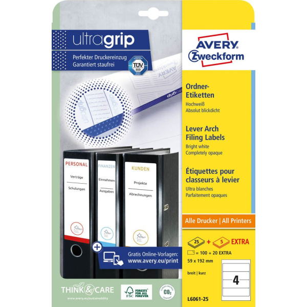 Gestalten Sie Ihre Ordner jetzt professionell und übersichtlich – entscheiden Sie sich für die Rückenschilder ultragrip L6061-25 von AVERY Zweckform!