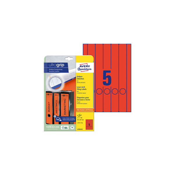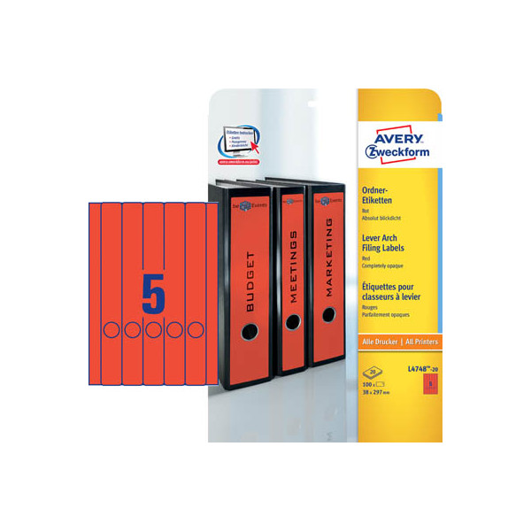 AVERY Zweckform selbstklebende Rückenschilder ultragrip L4748-20 rot schmal/lang 38x297mm (BxH) permanent