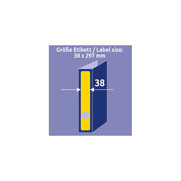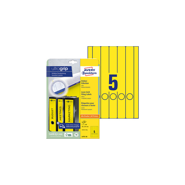 Die gelben, selbstklebenden Rückenschilder L4751-20 im Format 38 x 297 mm (schmal/lang) kleben dauerhaft sicher auf allen gängigen schmalen Standard Ordnern. Dank der ultragrip-Technologie können Sie sich auf einen ultrapräzisen Druckereinzug und staufreien Druckerdurchlauf verlassen. Sie erhalten 100 Ordner-Etiketten auf 20 Bogen. Die Rückenschilder sind besonders blickdicht und decken so alte Beschriftungen und Etiketten zuverlässig und sauber ab. Geeignet für alle gängigen Farb-/Laser- und Inkjet-Drucker sowie Kopierer.