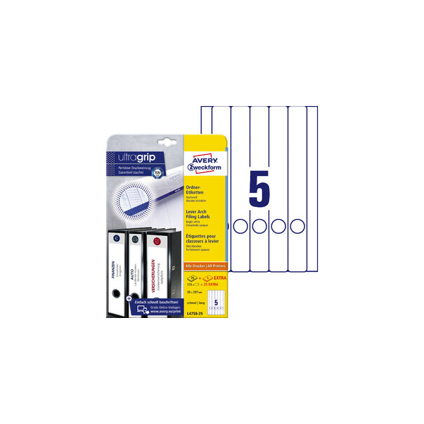 Bestellen Sie jetzt die selbstklebenden Rückenschilder ultragrip L4758-25 von AVERY Zweckform und bringen Sie Ordnung in Ihre Dokumente!