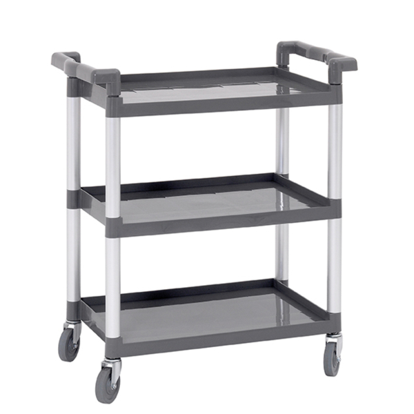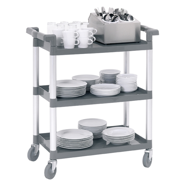 Entdecken Sie den praktischen Servierwagen TS Adjutant in elegantem Silber von Bartscher. Mit seinen kompakten Abmessungen von 83,0 x 41,5 x 94,0 cm ist dieser Wagen die perfekte Lösung für schnelles und sauberes Aufräumen in Gastronomie, Kantinen, Hotels und Krankenhäusern.