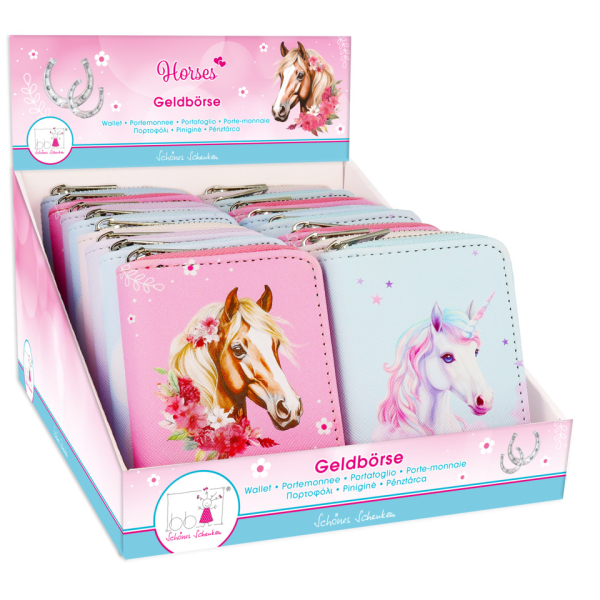 Praktisch und stilvoll: Die kompakte Geldbörse "Horses" (8,5 x 10 cm) überzeugt mit einem liebevollen Pferde-Design in fünf verschiedenen Ausführungen. Aus robustem PU-Material gefertigt, bietet sie ein Reißverschluss-Fach für Münzen sowie mehrere Steckfächer für Karten, Ausweise und Scheine. Ideal für Pferdefans, die Wert auf Ordnung und Design legen!