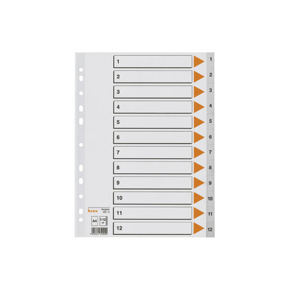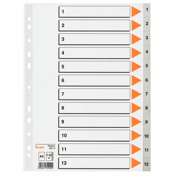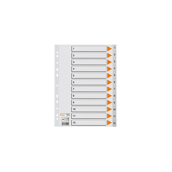 Bene 93212 Zahlenregister in A4. • Tabenfarbe: graue Taben • Registerteilung: 1 bis 12 • Lochung: Universallochung • Tabs nicht wechselbar