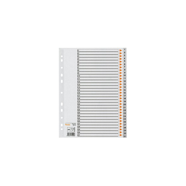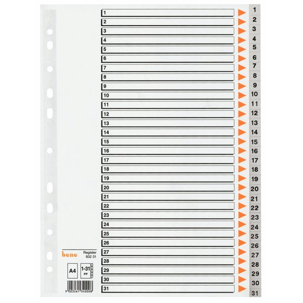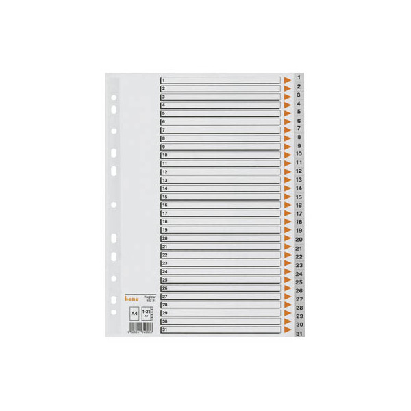 Bene Kunststoffregister 93231, 1 bis 31, A4, 120µm, graue Taben, 31-teilig