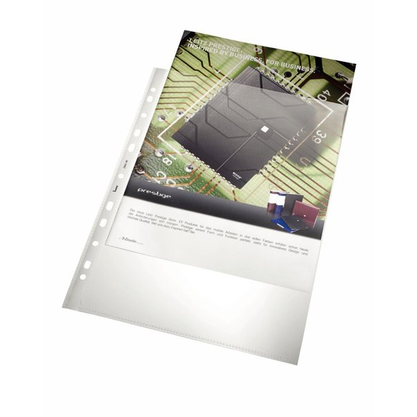Die Hüllen sind oben offen und ermöglichen ein einfaches Einlegen und Herausnehmen von Dokumenten. Mit einer Folienstärke von 0,14 mm sind sie stabil und langlebig, während die universelle Lochung eine flexible Nutzung in verschiedenen Ordnersystemen gewährleistet.