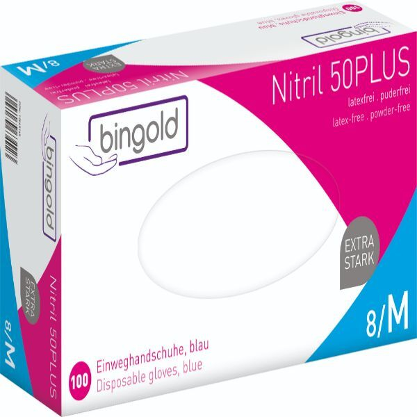 Bingold Einweghandschuhe Nitril 50Plus, Nitril, lebensmittelecht, blau, Größe 8 / M,