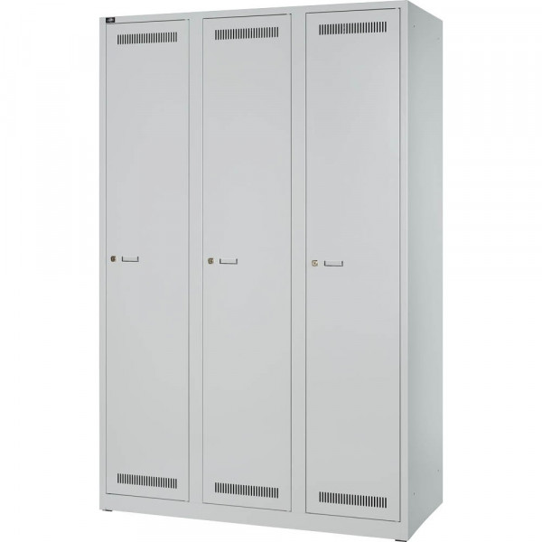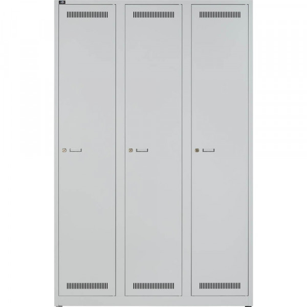 Garderobenschrank LIGHT ideal für den Einsatz in Betriebs- und Sozialeinrichtungen, sichere Aufbewahrung von Kleidung und mehr. Das Spind Light GL12T1245 von Bisley bietet Ihnen Qualität und Funktionalität in einem. Mit seinen 3 Abteilen und 3 Fächern bietet es ausreichend Stauraum für Ihre Kleidung und persönliche Gegenstände. Dank des abschließbaren Designs können Sie Ihre Wertgegenstände sicher aufbewahren. Der Zylinderschloss sorgt für zusätzliche Sicherheit. Das Spind hat eine Größe von 120x185cm (BxH) und ist in einem modernen lichtgrau erhältlich. Der Stahlkorpus gewährleistet Stabilität und Langlebigkeit. Mit einer Tragkraft von 70kg ist das Spind robust und belastbar.