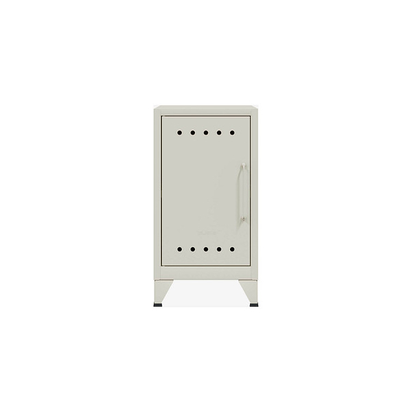 Der Fern Mini Stahlschrank wird aus hochwertigem, nachhaltigem Stahl hergestellt, sodass dieser Ablageschrank ein Leben lang hält. Der Schrank steht auf 140 mm hohen Füßen und wird komplett verschweißt geliefert, wodurch er umgehend einsatzbereit ist. Ein besonderer Eye-Catcher sind die 16 mm großen Design Lüftungslöcher auf allen Türen, die das individuelle Erscheinungsbild von Fern Mini prägen.
