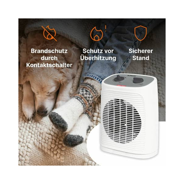 Der Heizlüfter stellt höchste Sicherheit in den Vordergrund: Der Überhitzungsschutz Überhitzungsschutz und ein Sicherheitskontaktschalter Sicherheitskontaktschalter minimieren das Risiko von Bränden. Eine Kontrollleuchte zeigt den Betriebszustand des Geräts an. Mit einer Spannung von 220–240 V, einer Frequenz von 50/60 Hz und einer maximalen Leistung von 2000 W bietet unser Heizlüfter zuverlässige Leistung. Der sichere Stand verhindert ein Umkippen. Mit diesem Heizlüfter genießen Sie Wärme und Komfort zu jeder Jahreszeit.