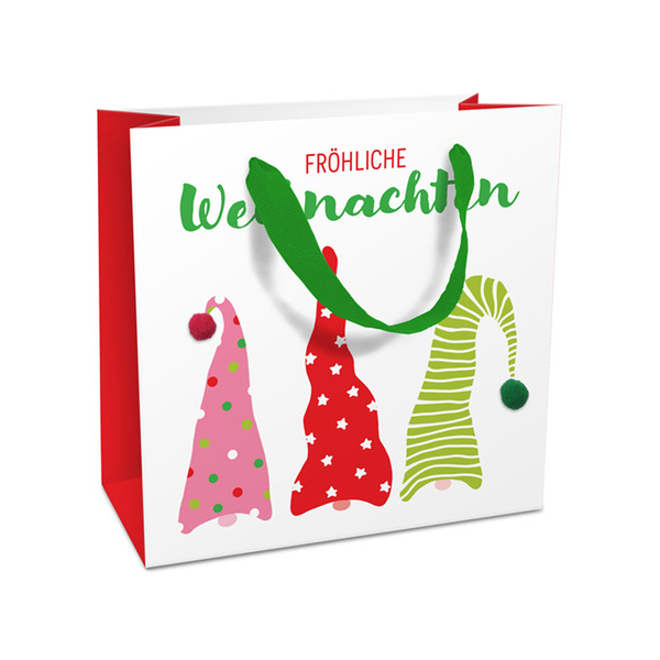 Entdecken Sie die wunderbare Geschenktasche 1685-25502 von Braun und Company, die mit ihrem charmanten Design begeistert. Die matte Geschenktragetasche „Wichtelmützen“ überzeugt nicht nur durch ihr fröhliches Aussehen, sondern auch mit kleinen Bommeln als liebevollem Detail und einem hübschen grünen Trageband.