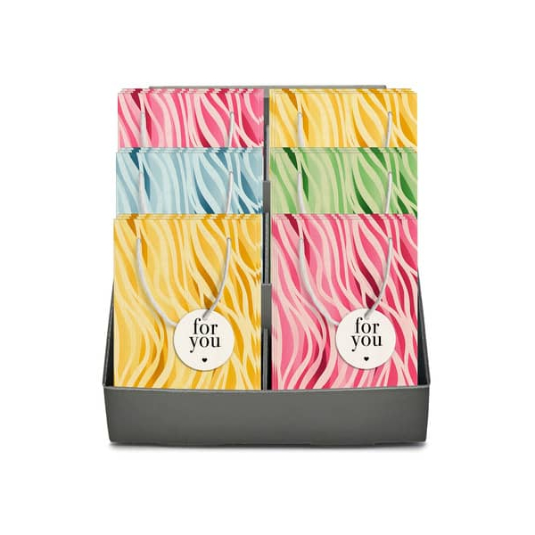 Geschenktasche 4001-0199, • Anlass: allgemein • Ausführung: Tragegriff Kordel mit Anhänger • Motiv: Wellen • Farbe: sortiert/rosa/gelb/grün/blau • Breite: 180mm • Höhe: 120mm • Tiefe: 60mm